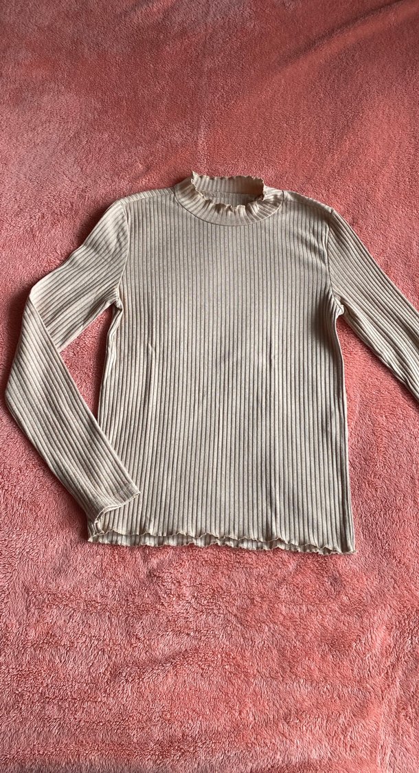 Bej renkli, uzun kollu, balıkçı yaka ve fırfır detaylı, yumuşak keten kumaştan yapılmış dar kesim kazak. Günlük rahat kullanım için uygundur. Omuz genişliği:36, omuzdan boy:57, iki koltuk arası: 38, kol boyu:58. Kotondan almıştım etiketi rahatsız ettiği için kestim herhangi bir deformesi yoktur vücudu komple saran bir model 3 kere kullandım sadece