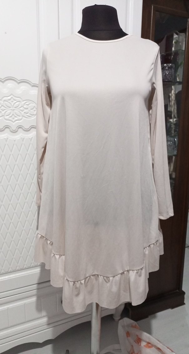 boy 99 cm göğüs 50 cm beden genişliği 67 cm ince kumaş iç gösterir Bej renk, uzun kollu ve yüksek yakalı uzun tunik. Bol kesim ve etek kısmında fırfır detayları bulunur. Yumuşak sentetik kumaştan, günlük kullanıma uygun bohem tarzda.40/42 beden