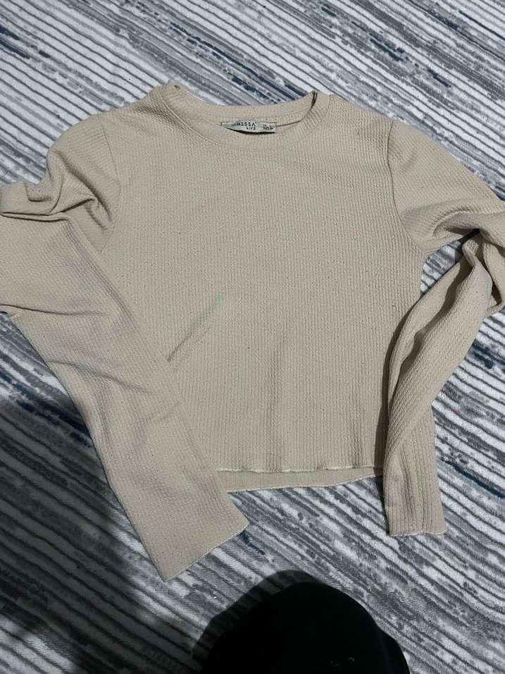 Bej renkli, yumuşak keten kumaştan yapılmış, uzun kollu, fitted kesim ve bisiklet yaka kadın triko. Günlük kullanım için rahat ve şık.