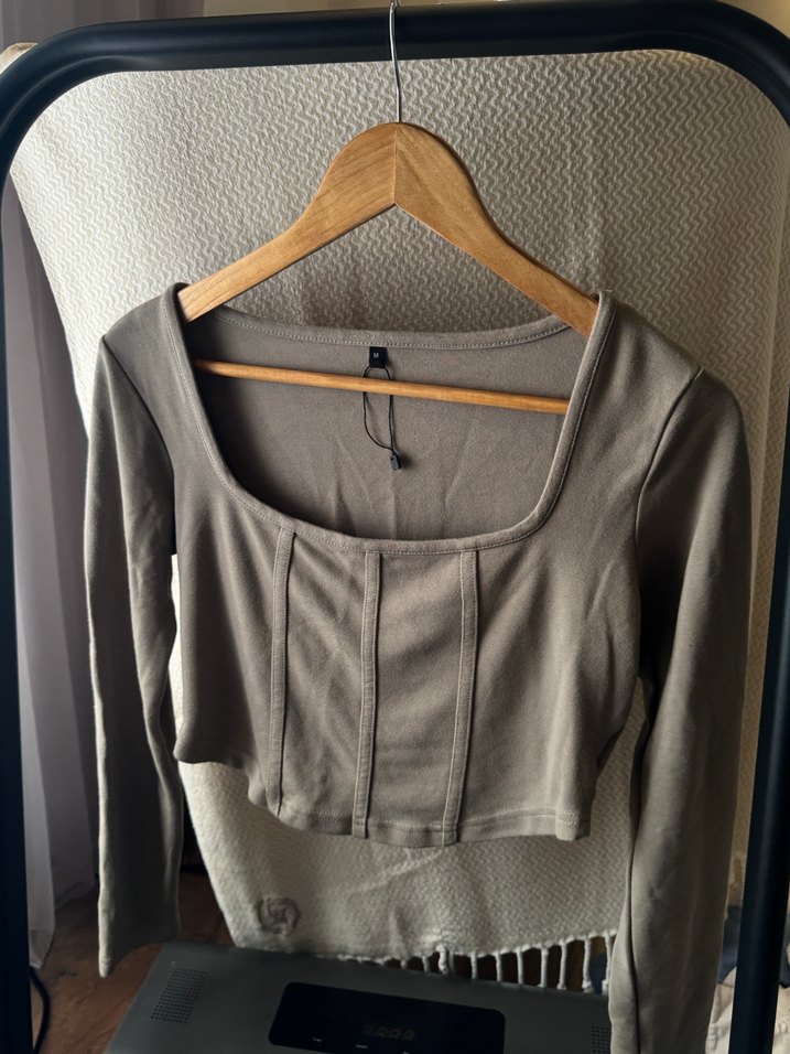 Bej renkli, uzun kollu, keten kumaştan yapılmış, kare yakalı ve vücuda oturan kadın bluzudur. Desensiz sade tasarımı ile günlük ve sokak stiline uygundur. Rahat ve şık bir görünüm sunar.
