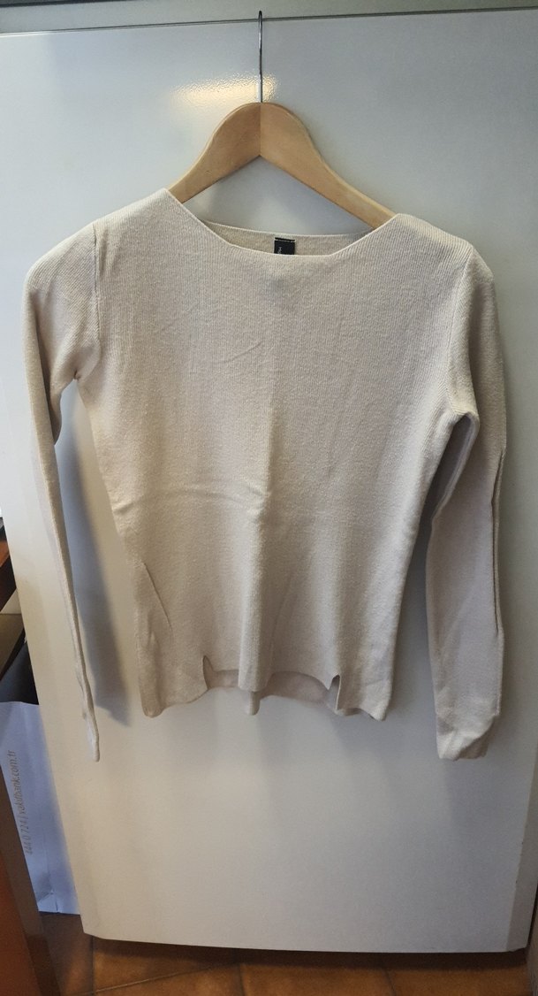 Bej renkte, keten kumaştan, uzun kollu ve yuvarlak yakalı kadın kazak. Rahat ve bol kesimli, günlük sokak stili için ideal midi boyda.