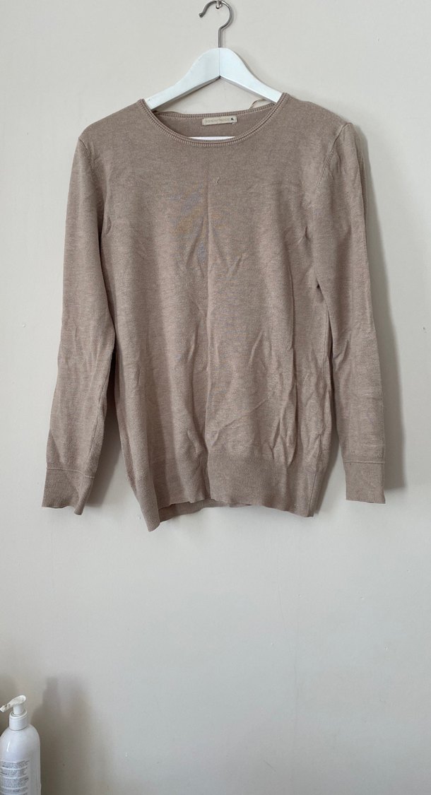 Bej renkli, uzun kollu, yuvarlak yakalı ve bol kesim keten kumaştan yapılmış kadın kazak. Minimalist ve rahat bir tarz sunar.