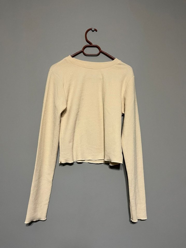 Bej renkli, keten kumaştan yapılmış, uzun kollu ve yuvarlak yakalı, sade ve minimal tasarımlı kadın sweatshirtü.