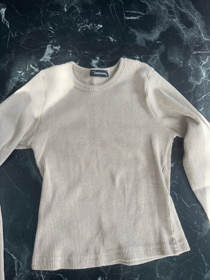 Bej renk, uzun kollu, bisiklet yaka ve ince kesimli triko. Yumuşak kumaştan üretilmiş, sade ve rahat bir görünüm sunar.
