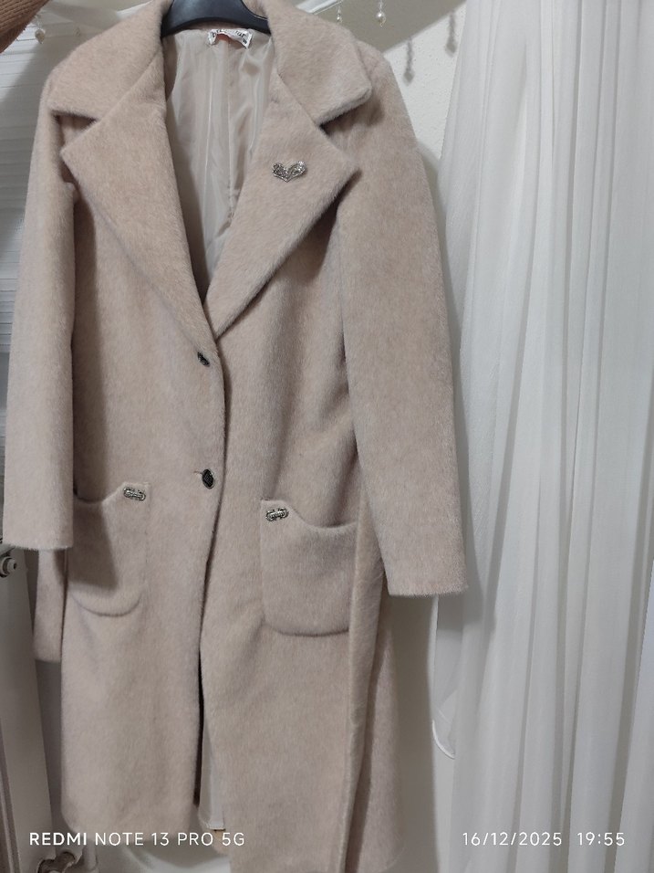 Bej renkte, uzun boylu ve regular fit kadın kaban, kürk detaylı cepler ve kesik yaka ile modern klasik tarzda, yumuşak kumaştan üretilmiştir. 38 bedendir hiç giyilmedi
