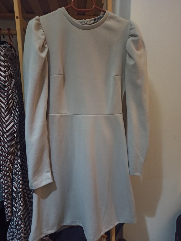 Yeni durumdadır. Ölçü bilgileri fotoğrafta bulunuyor. Gri renkte, uzun kollu ve bisiklet yaka detaylı, midi boyda bir elbise. Yumuşak sentetik kumaştan, günlük kullanıma uygun.