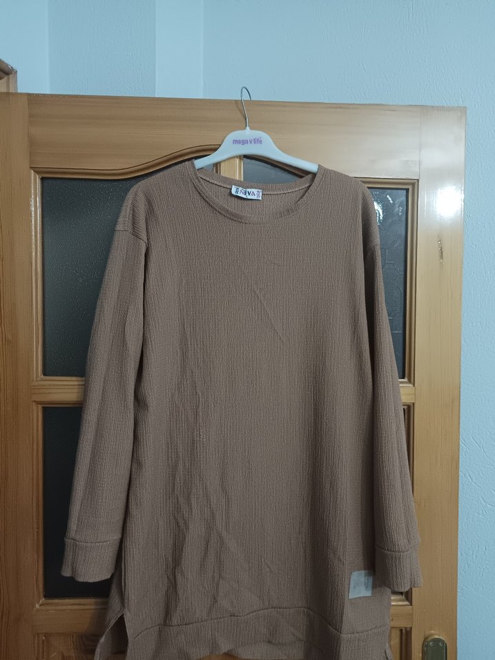 Bej renkli keten kumaştan, uzun kollu, bisiklet yaka ve bol kesime sahip midi uzunluğunda tunik. Desensiz, rahat ve gündelik kullanıma uygun.