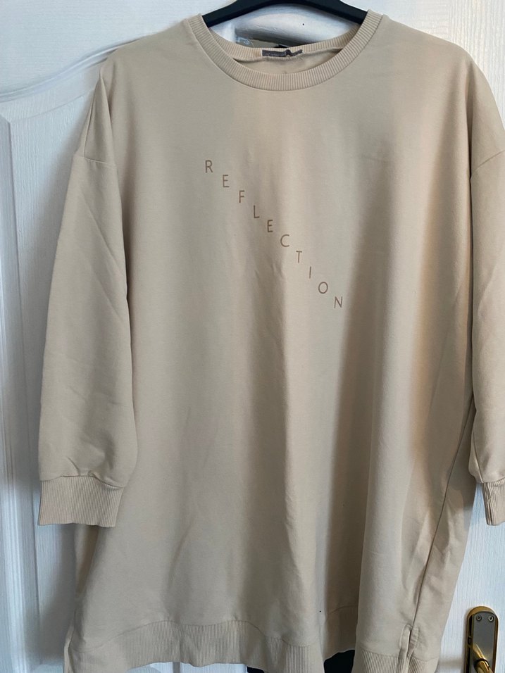 Bej renkli, uzun kollu, oversize kesim sweatshirt. Parlak baskılı 'REFLECTION' yazısı ve yumuşak keten kumaşı ile günlük kullanıma uygundur. Boyu 80 cm