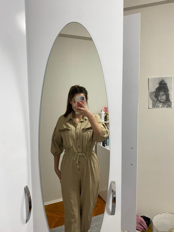 Bej renkli, pamuklu kumaştan yapılmış, kısa kollu ve yakalı kadın tulumu. Belden bağlamalı, rahat kesim, günlük kullanım için şık ve rahat.
