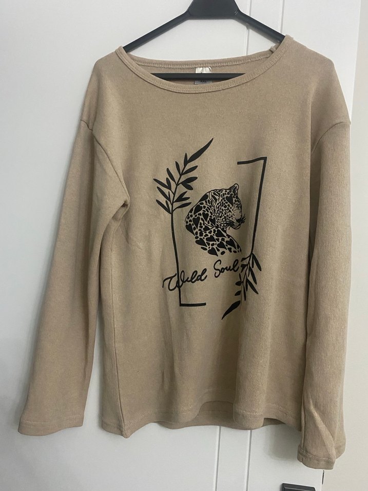Uzun kollu, bisiklet yaka, bol kesim bej baskılı yaban kedisi deseni ve örme dokusuyla rahat bir kullanım sunar. Pijama takımı veya günlük evde eşofman takımı olarak da kullanılabilir