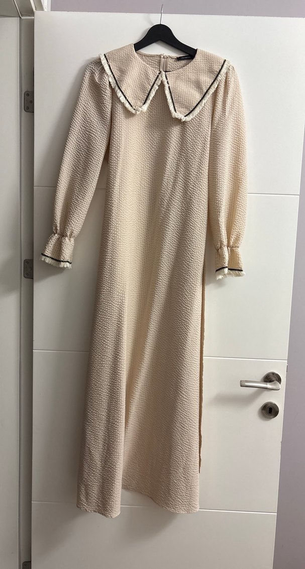 Bej renkte, uzun kollu, pilili ve işlemeli detaylara sahip uzun elbise. Notlu yaka ve klasik zarafeti yansıtan normcore tarzıyla günlük kullanıma uygundur.