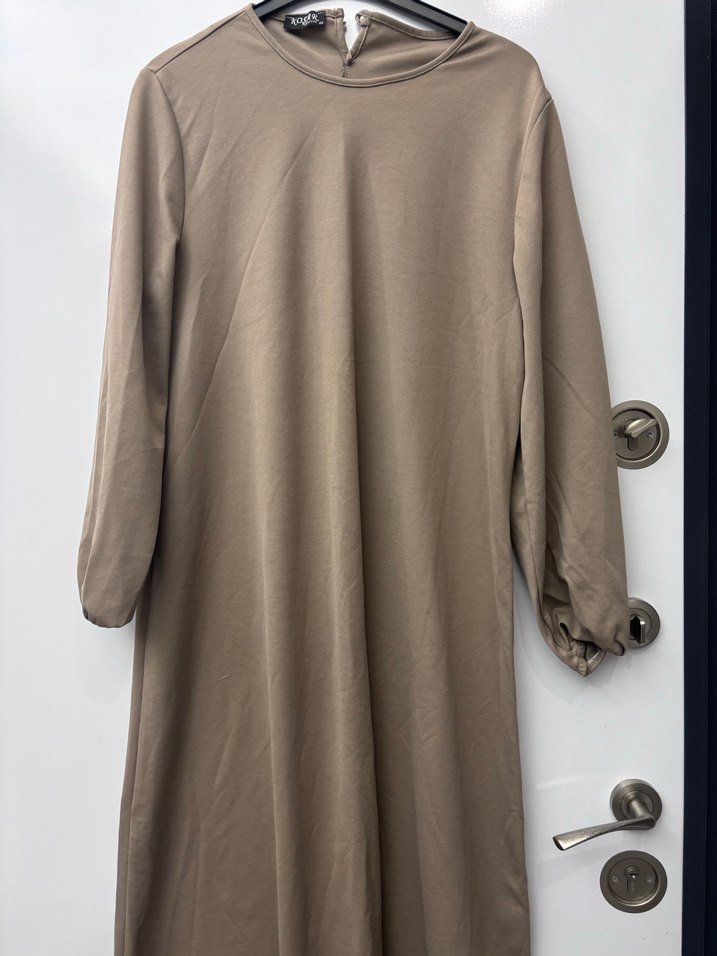 Bej renkli, yuvarlak yakalı ve uzun kollu, salaş kesimli uzun elbise, günlük kullanım için yumuşak sentetik kumaştan yapılmıştır.