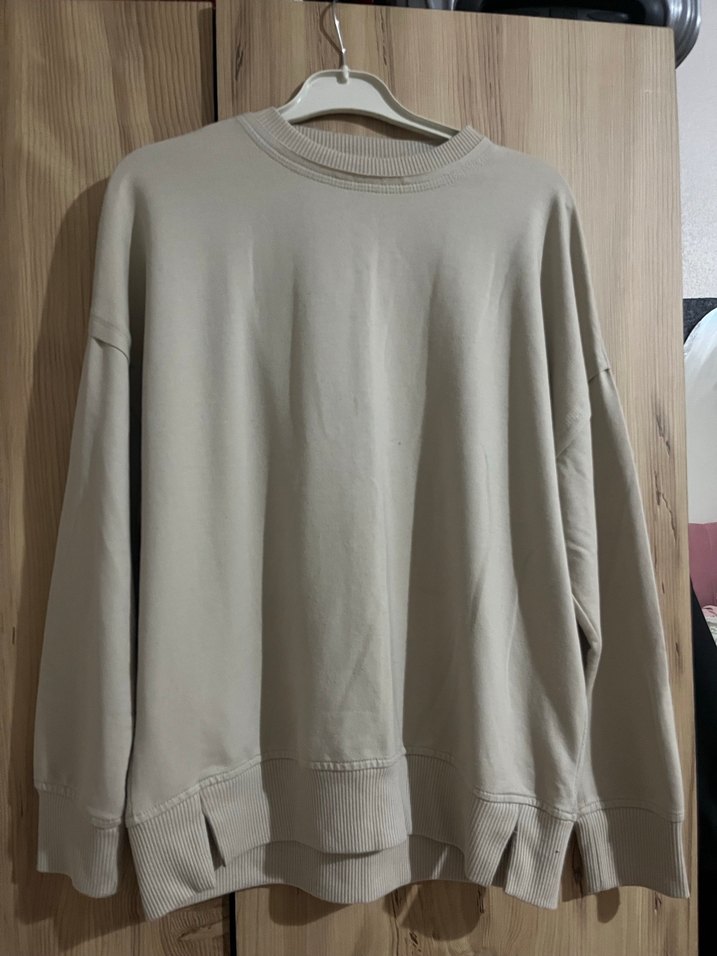 Bej renkli, uzun kollu, bisiklet yaka ve salaş kesim kadın sweatshirtü. Yumuşak keten kumaştan, normal boyda, yanlarda yırtmaç detaylı, rahat ve şık bir tasarım.
