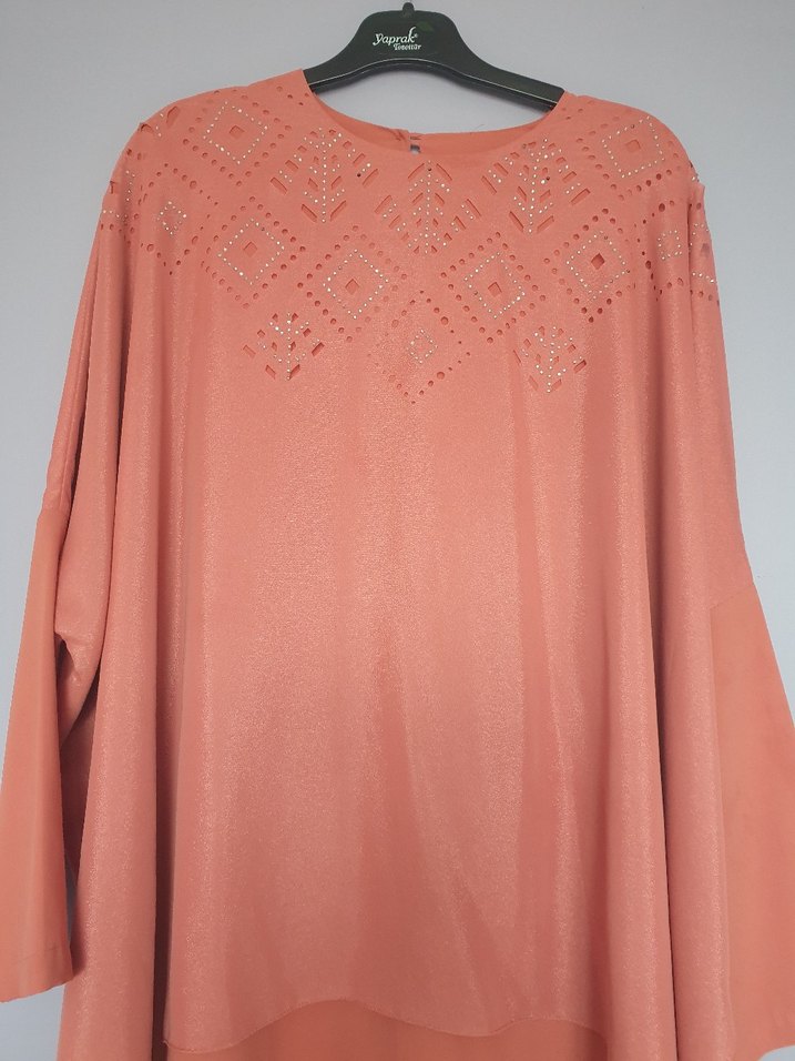 Bej renkte, uzun kollu, bisiklet yaka ve salaş kesim tunik. Parlak sentetik kumaştan, sade ve uzun boyda, günlük kullanıma uygun. ✨