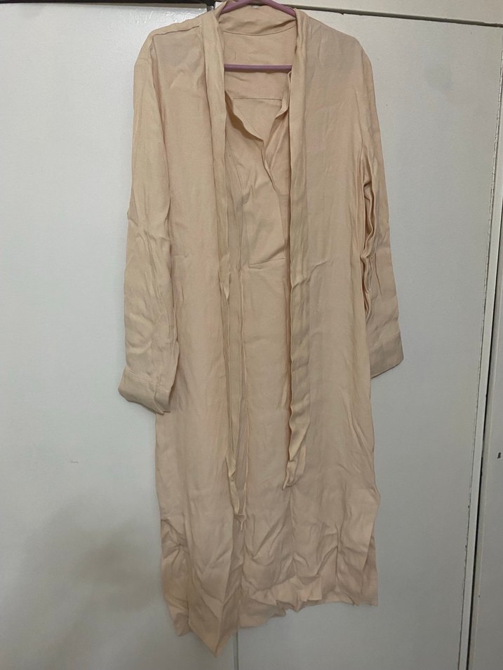 Bej renkte, uzun kollu ve salaş kesim uzun elbise. Minimalist ve normcore tarzıyla desensiz, pastel tonlarda sade bir görünüm sunar.