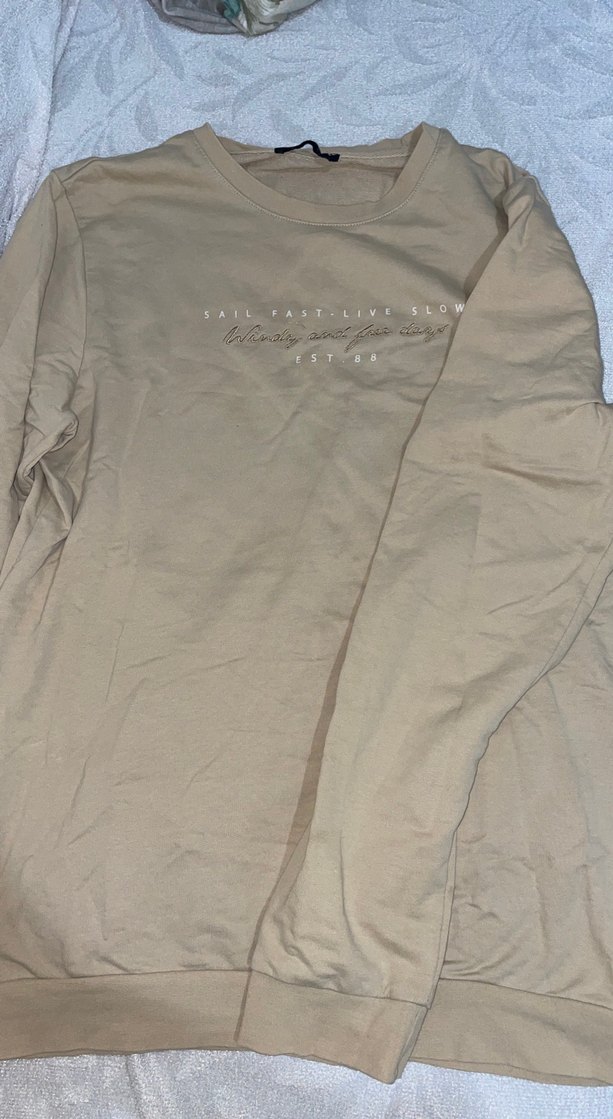 Bej renk, uzun kollu, yuvarlak yakalı ve bol kesim kadın sweatshirtü. Yumuşak keten kumaştan, günlük sokak stili için hafif yazılı detaylı.