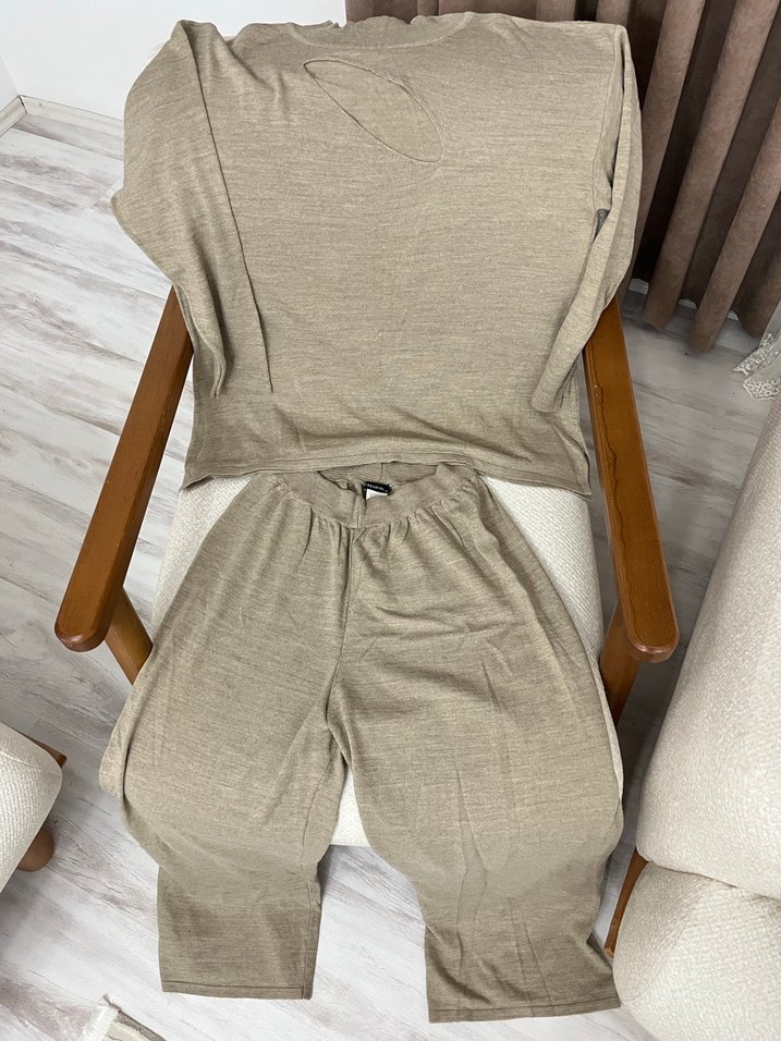 Bej renk, uzun kollu, bisiklet yaka,geniş paça ve bol kesim kadın takım. Desensiz yapısıyla rahat ve sade bir normcore stil sunar. Göğüs yakası açık değil giyince normal duruyor dekolte yok