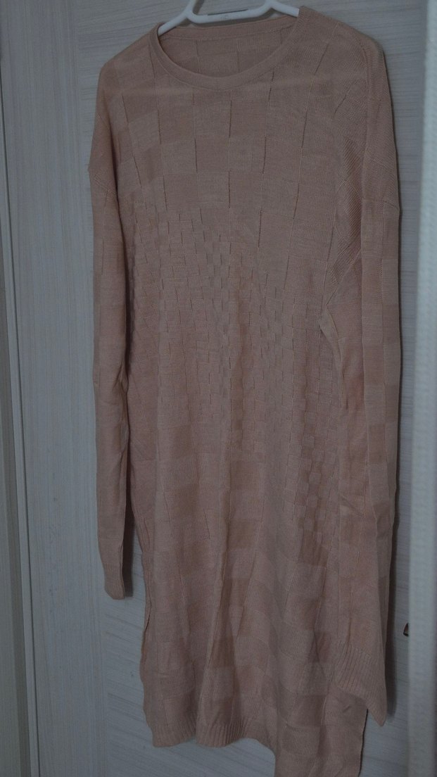 Bej renkte, uzun boylu, triko dokulu, yuvarlak yakalı ve bol kesim kadın süveter. Yumuşak keten kumaştan yapılmıştır, günlük kullanıma uygundur. deforme yoktur.