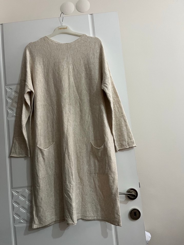 Bej renkli, keten kumaştan, uzun kollu ve bol kesim kadın elbisesi. Bohem ve sade tasarımıyla rahat günlük kullanım için uygundur.