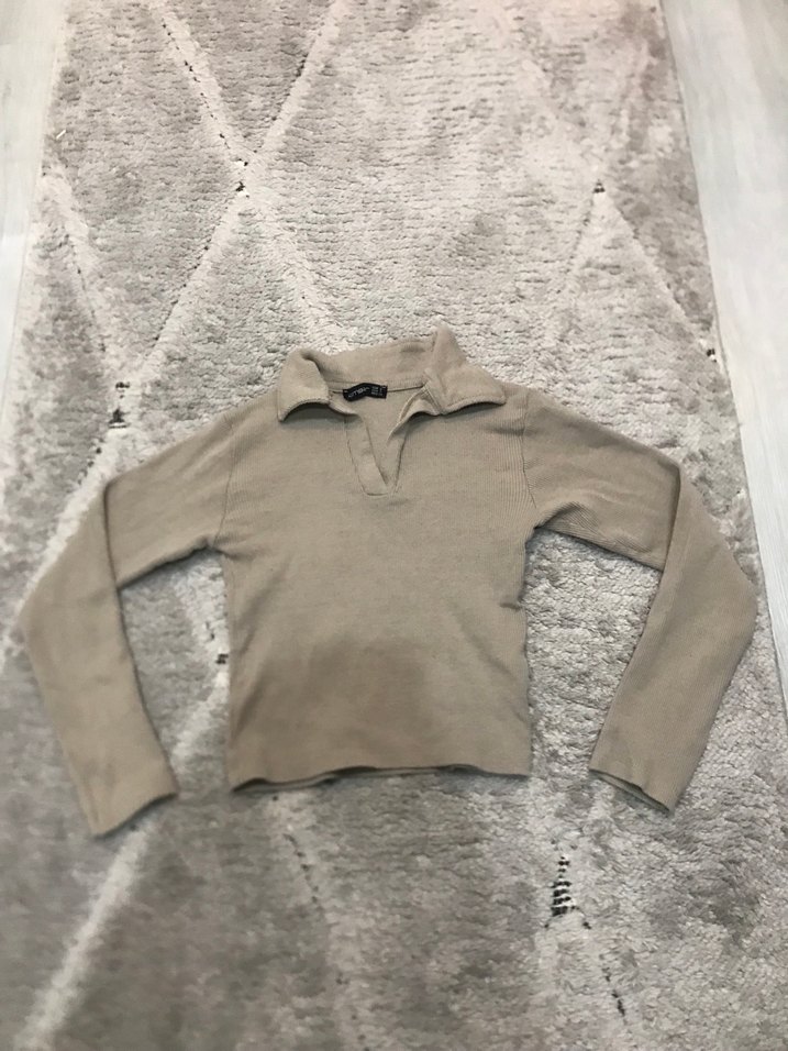 Uzun kollu, yakalı ve ince kesim bej kazak. Yumuşak ve sıcak kumaştan, rahat ve şık bir günlük sokak stili kazak.