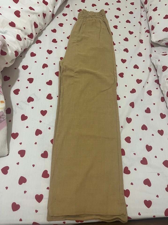 Bej renkli, uzun kumaş pantolonlar, düz ve sade tasarımı ile günlük kullanım için uygun, rahat bir görünüm sunar.