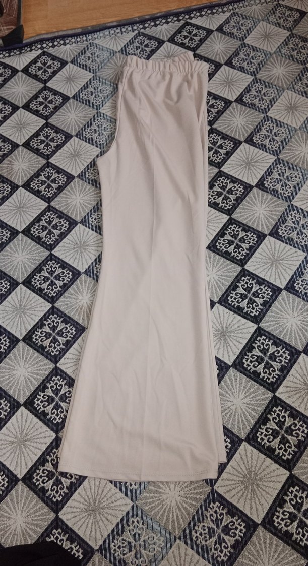 Bej renkte, drapeli tasarıma sahip, yumuşak sentetik kumaştan uzun kadın pantolonu. Günlük kullanım için uygun, minimalist sokak stiliyle uyumlu.