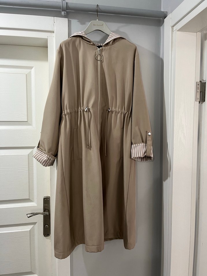 Bej renkli, uzun ve bol kesim kuşaklı trençkot. Sentetik kumaştan, uzun kollu ve yakasında kesik detay bulunur. Günlük rahat stil için uygundur.