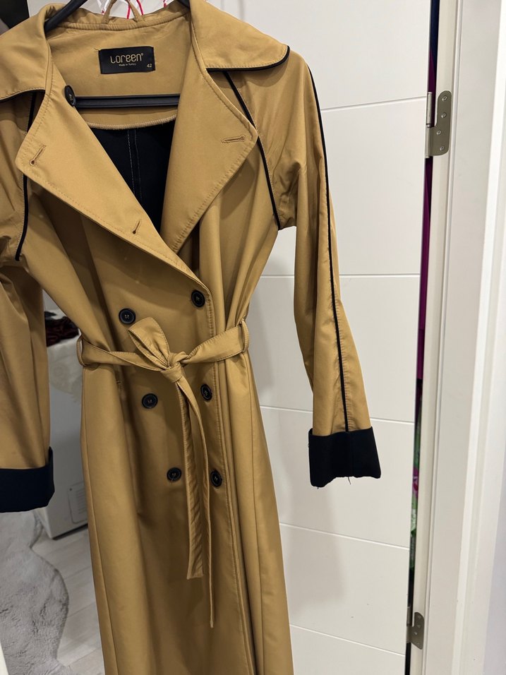 Bej uzun kuşaklı trençkot, kesikli yaka ve regular kesim ile. Kolları şerit detaylı, sentetik dokulu kumaştan günlük rahat kullanım için uygun. Bir kaç yerinde lekesi var cıkarmı bilmiyorum harici bi problemi mevcut değildir