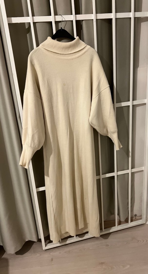 Bej renkli, yüksek yakalı ve uzun kollu bu uzun yün elbise, gevşek kesimi ve örgü dokusuyla rahat ve şık bir görünüm sunar. 3844 arası uyumludur balon koldur