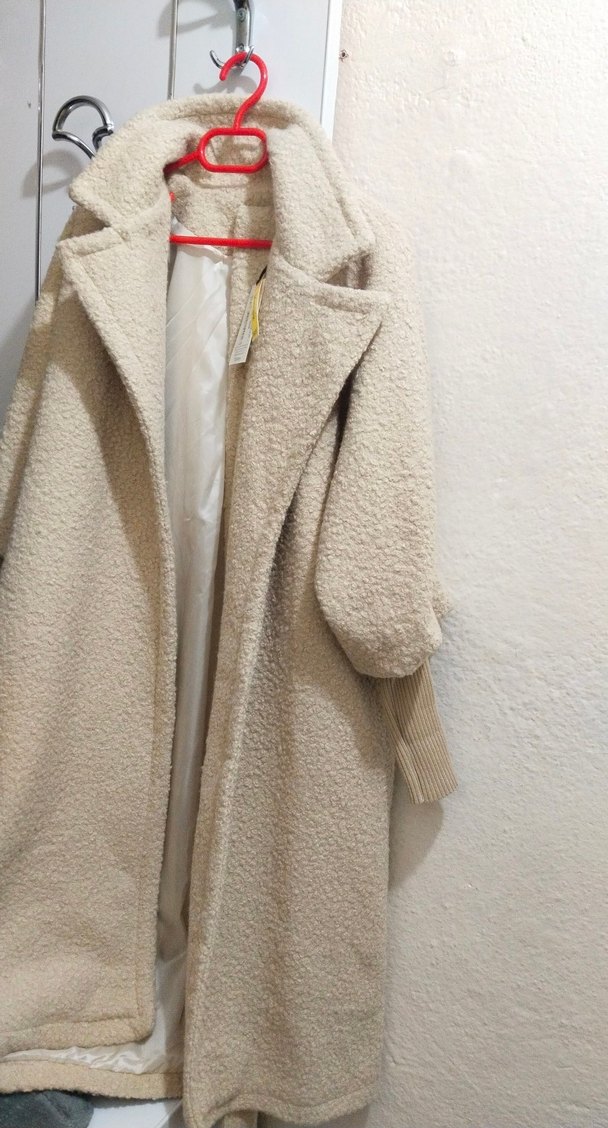 Bej renkte, uzun ve bol kesim kadın kaban. Yumuşak peluş kumaş ve kürk detaylı, uzun kollu ve ribanalı manşetlere sahip. Rahat sokak stili için uygun.teklife açığım