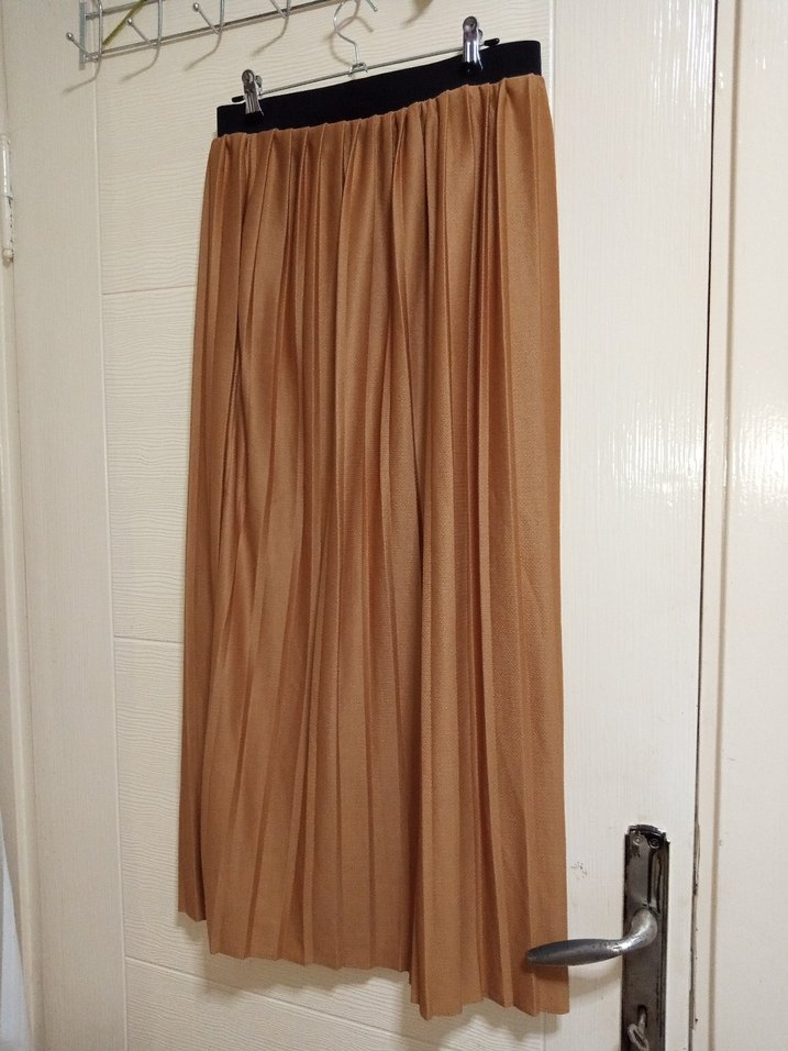 Bej renkte, keten kumaştan uzun ve pilili, bol kesim etek. Parlak dokusu ve minimalist bohem tarzıyla günlük kullanıma uygundur.