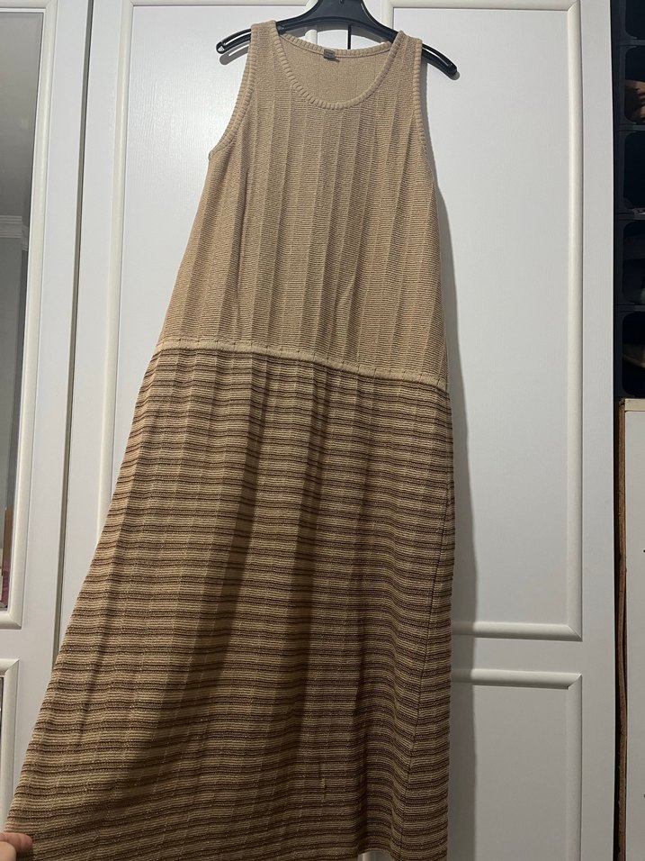 Bej renkli uzun, kolsuz triko elbise, pilili ve bol kesimdir. Yuvarlak yakalı ve bohem tarzda, günlük kullanıma uygundur. Takım