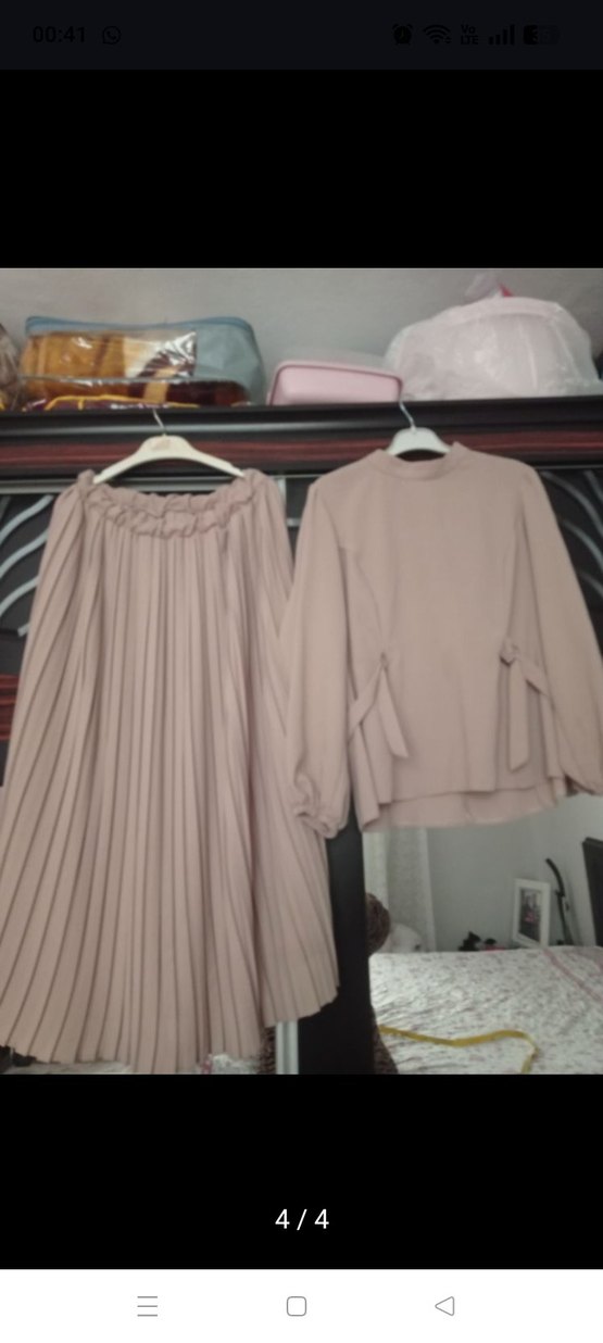 Bej renkte, uzun kollu, yüksek yakalı ve piliseli detaylara sahip bol kesim, yumuşak keten kumaştan minimalist ve trend günlük şıklık için uygun. 48 beden kumşı Krep İkili takım