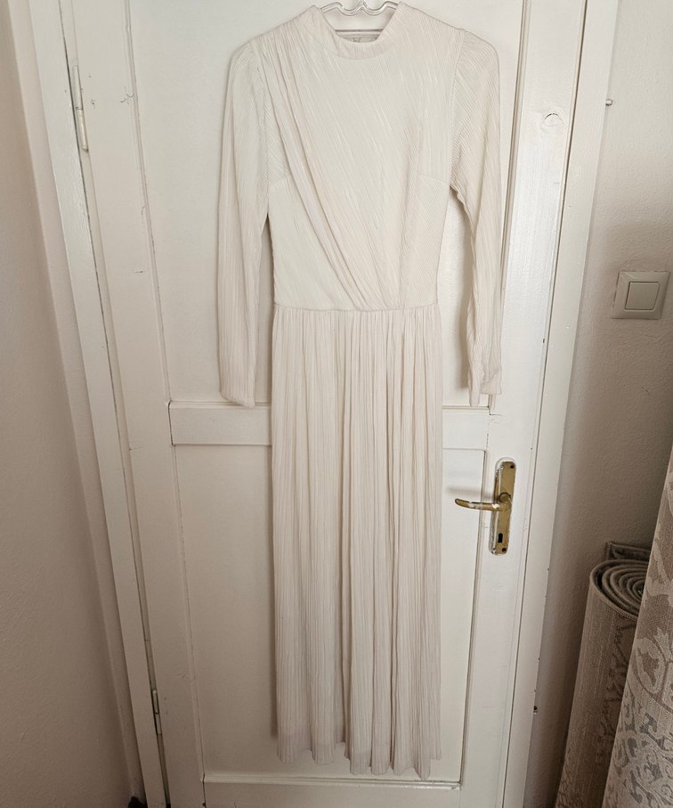 Bej renkte, yüksek yakalı ve uzun kollu uzun bir elbisedir. Piliseli detayları ve dar kesimiyle vintage ve bohem tarz sunar, düğünler için uygundur.
