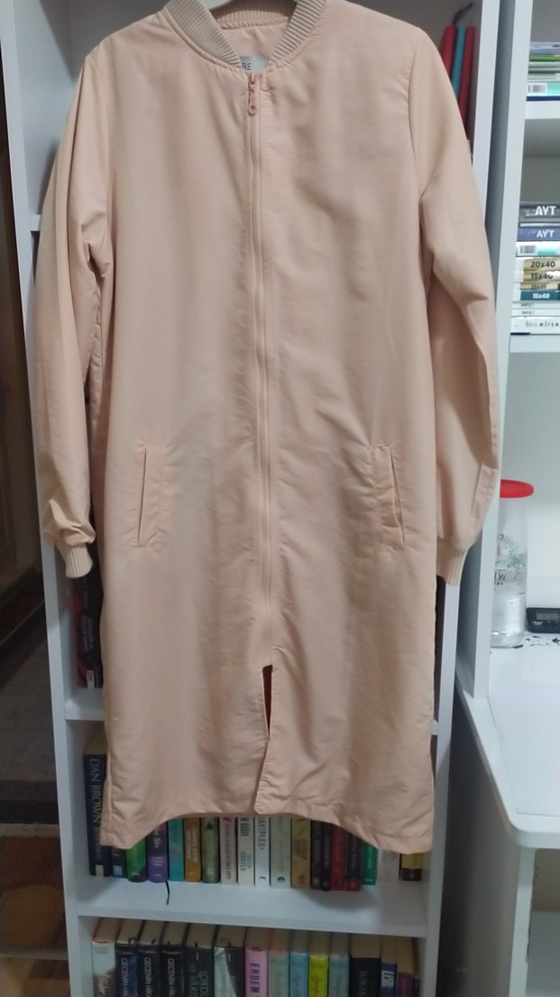 Bej pembemsi renkte, uzun kesim, yüksek yakalı ve fermuarlı kadın yağmurluğu. Rahat kesim ve uzun kollu, yumuşak sentetik kumaştan günlük kullanım için uygun. Minimalist ve desensiz tasarım sade tarz için.