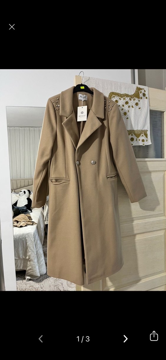Bej renkli, uzun boylu kadın kabanı, düğmeli ve süet kumaştan. Uzun kollu, klasik kesim ve Paris tarzıyla ofis için uygun şık bir parça. ✨
