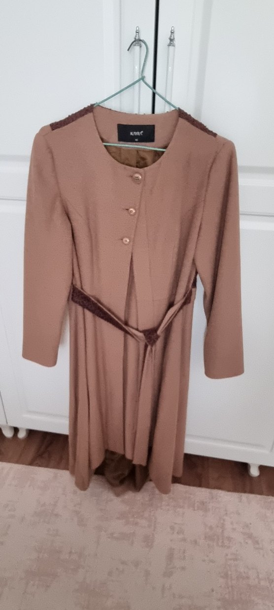 Bej renkli, uzun kesim kadın süet kaban, düğmeli ve kemer detaylıdır. Uzun kollu ve klasik şıklıkta, ofis için uygundur.