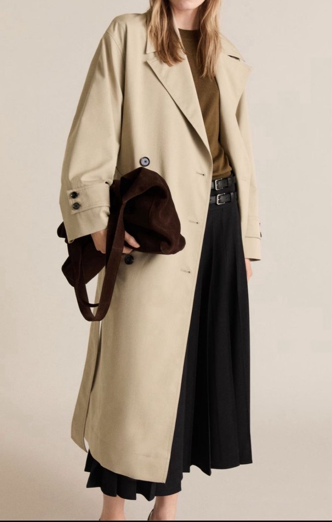 Bej renkli, uzun kol ve kesik yaka detaylı kadın süet trençkot. Günlük kullanıma uygun, rahat kesim ve şık görünüme sahip.