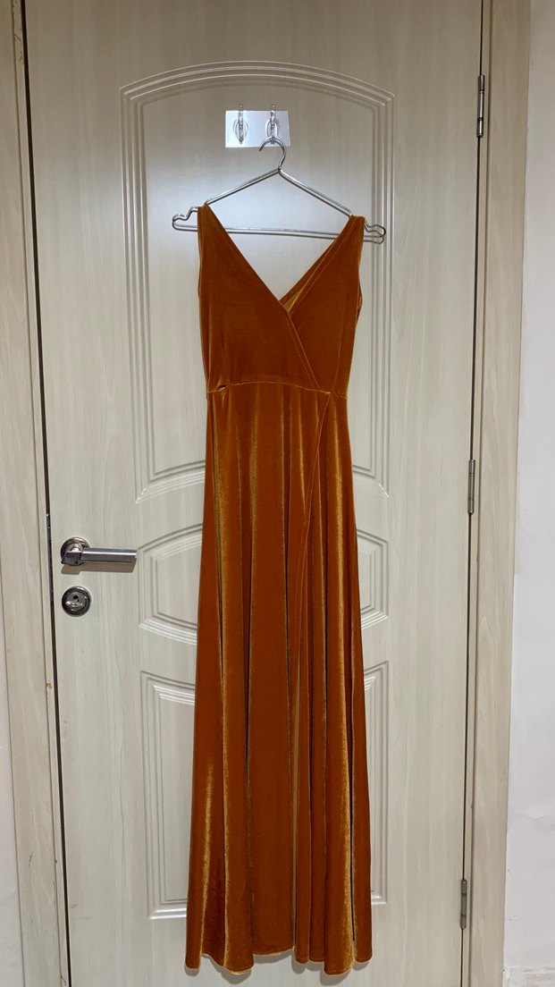 Bej renkli uzun süet elbise, drapeli ve askılı V yaka tasarıma sahiptir. Vintage ve bohem tarzlara uyumlu, düğünler için ideal. Biraz dikiş atılması gerekiyor