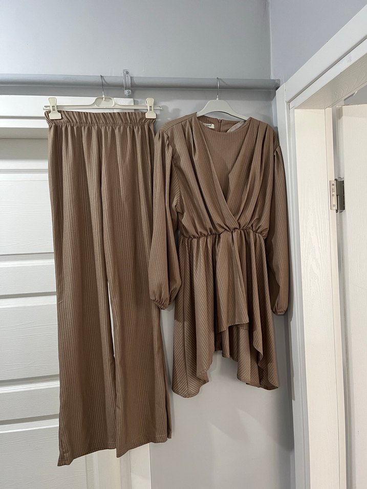 Bej renkli dökümlü ve bol kesim kadın uzun takım. Minimalist ve çağdaş tarzda, günlük kullanıma uygun rahat model. Topu askılı kollu ve asimetrik kesimlidir. Önü ve yaka gibi duruyor hiçbir kusuru yok beden olarak iki beden yazıyor ben 40 bedenken almıştım dar gelmişti 38 bedene rahatlıkla olur