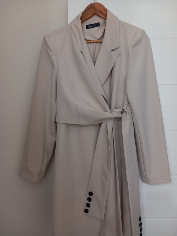 Bej renkli, uzun ve düğmeli kadın trench coat. Notlu yaka ve uzun kollu, sentetik kumaştan, ofis ve günlük kullanıma uygun.