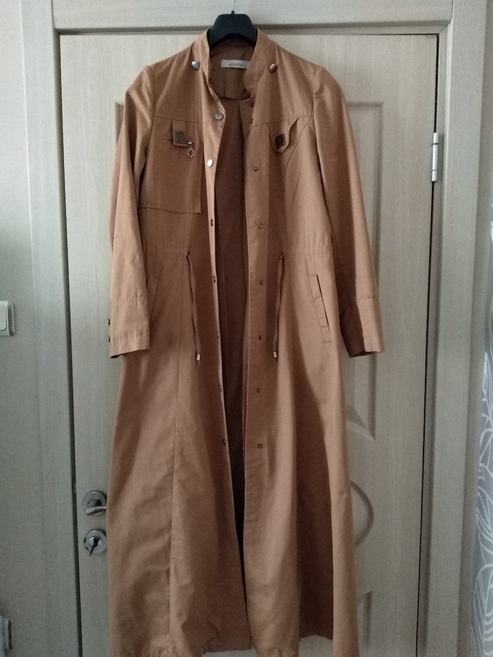 Bej renkli kadın uzun trençkot, düğmeli ve regular fit. Notched lapel yaka ve uzun kollu, yumuşak süetten yapılmıştır. Günlük kullanıma uygun, desensiz ve sokak tarzı şıklığı sunar.