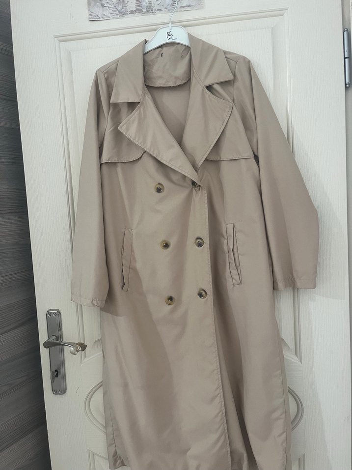 Bej renkli, uzun kesim, düğmeli kadın trençkotu. Notlu yakalı, bol kesim ve uzun kolludur. Sentetik kumaştan, günlük sokak stiline uygun.