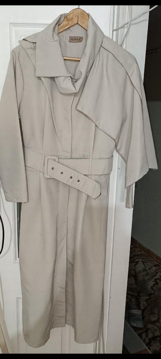 Bej renkli, uzun ve kemerli kadın trençkotu. Notlu yaka ve uzun kollu, düz desensiz tasarıma sahip. Ofis için uygun, sokak tarzı dokunuşlu.