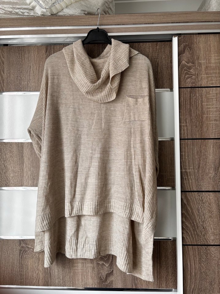 Bej renkli, uzun kesim, bol kesim triko kazak. Keten dokusu ve boğazlı yaka ile rahat ve gündelik kullanıma uygun. Desensiz, uzun kollu tasarım. Standart beden 48 bedene kadar uyumlu