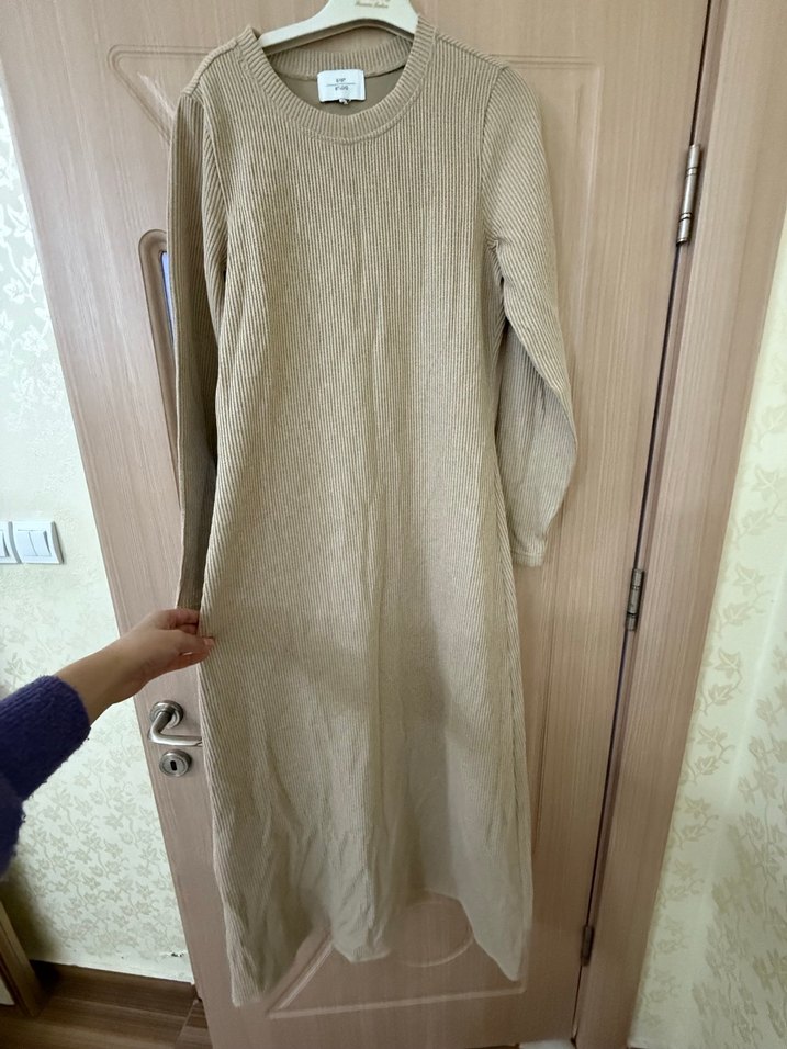Bej renkli, triko dokulu keten kumaştan uzun elbise. Yuvarlak yaka ve uzun kollu, bol kesim, desensiz sade tasarım.