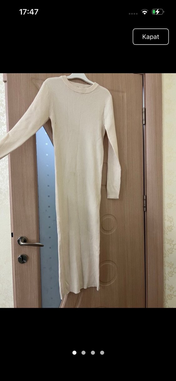 Bej renkte, uzun kollu ve kruvaze yaka detaylı, vücuda oturan uzun triko elbise. Yumuşak sentetik kumaştan, minimal ve normcore tarzında günlük kullanıma uygun.
