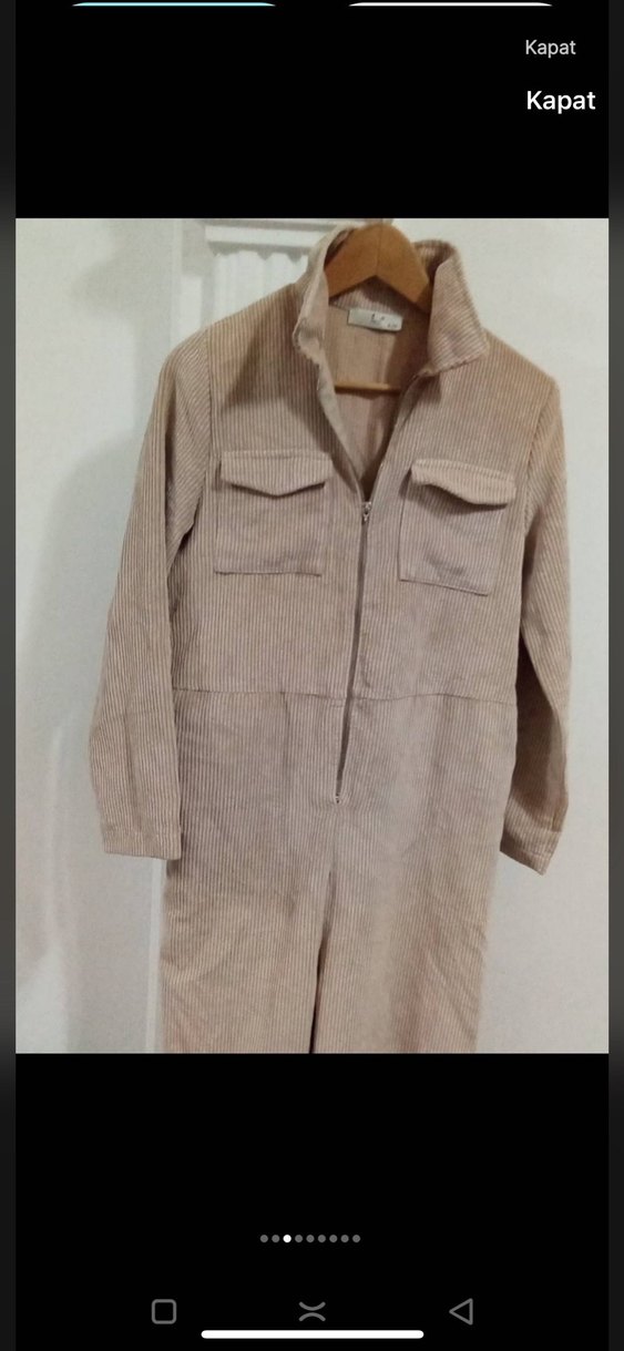 Bej renkli, uzun kollu ve düğmeli ön cep detaylı kadın uzun tulum. Yumuşak keten kumaştan, günlük kullanıma uygun rahat bir tasarım.