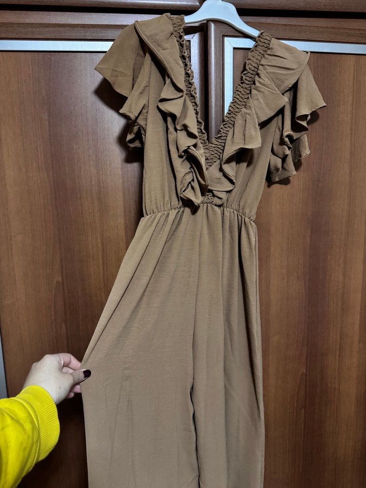 Bej renkli, likrali penye kumaştan yapılmış, uzun ve bol kesimli kadın tulumu. V yaka ve fırfır detaylarıyla bohem tarzını yansıtır. Kolsuz tasarımı rahat bir görünüm sunar.