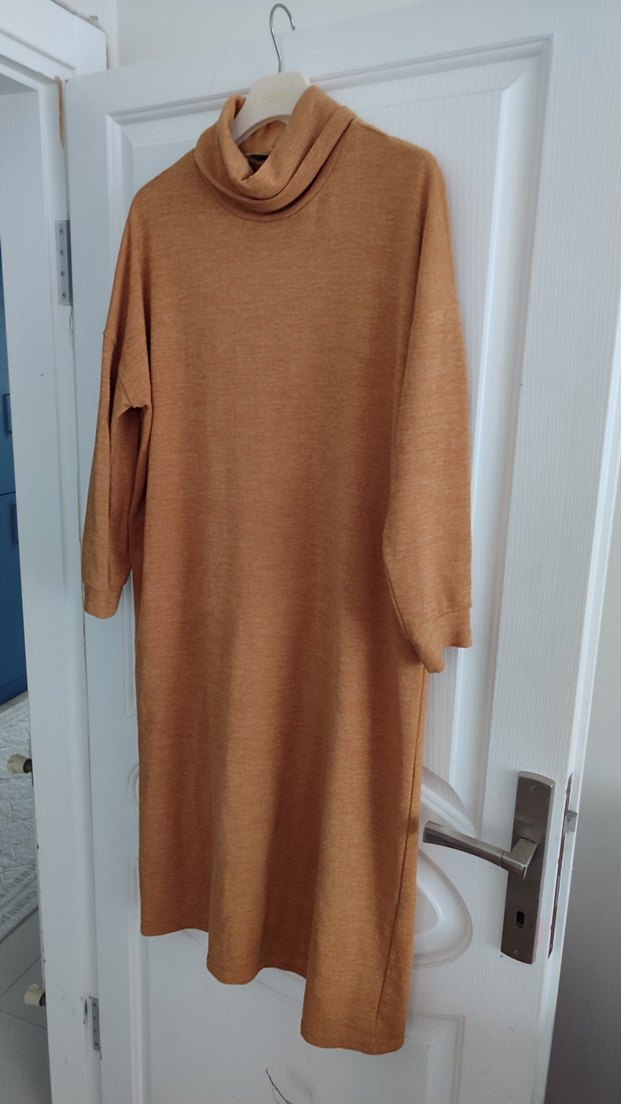 Bej renkte, yüksek yakalı, uzun kollu, yumuşak yün kumaştan rahat kesim kadın uzun elbise. Günlük kullanım için uygun, konforlu ve şık görünümlü.